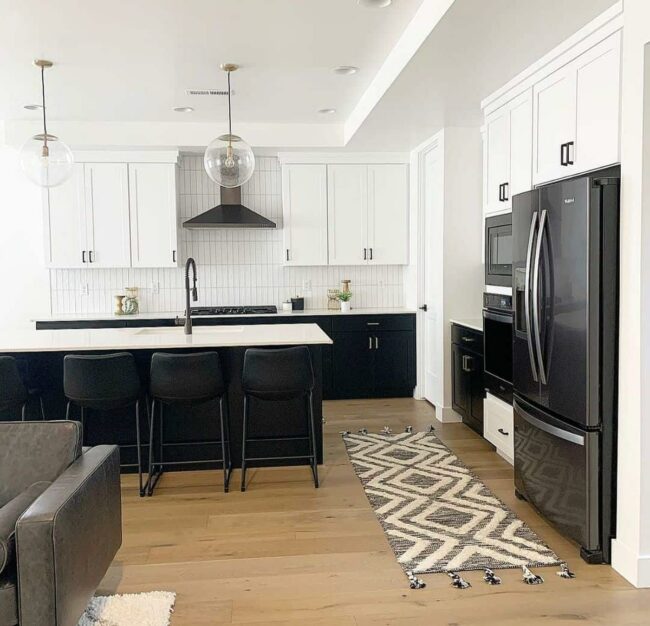 Black metal industrial farmhouse pendant lights add dramatic edgy contrast, pulling visual attention skyward with understated elegance.
