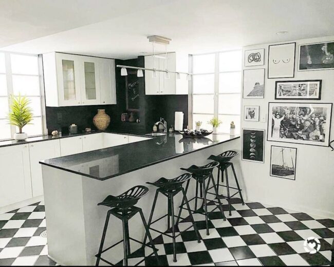 Black metal bar stools perfectly balance the space, offering comfortable seating for casual moments.