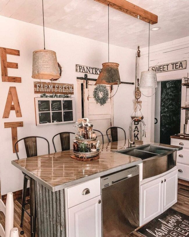 Black pendant lights hover overhead, adding a modern accent to the rustic farmhouse aesthetic.