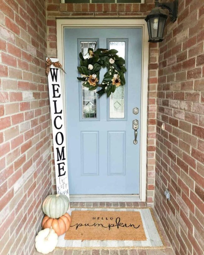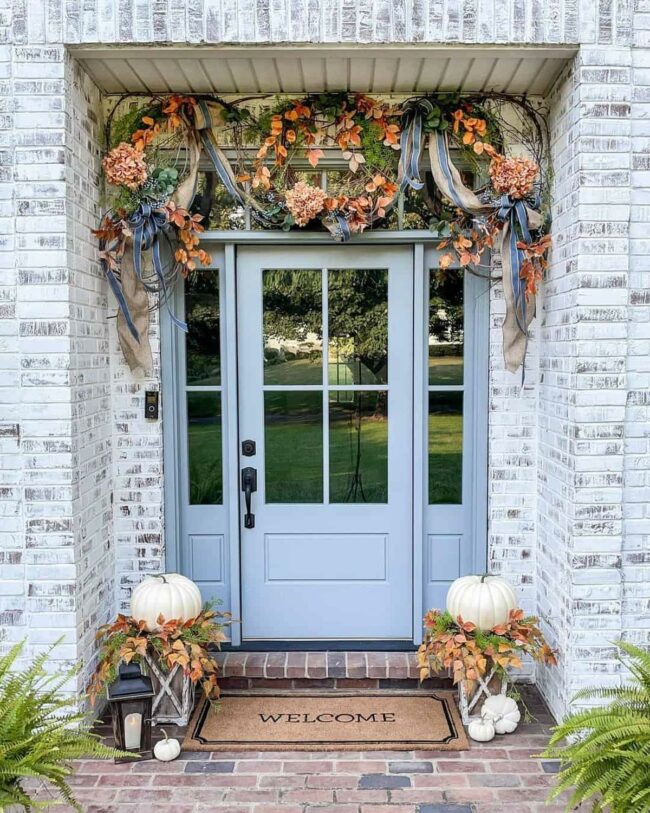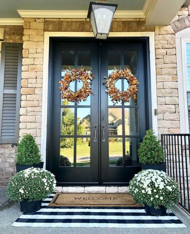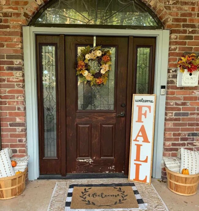 Fall decorations showcase warmth and creativity around a dark wooden door with glass panels.