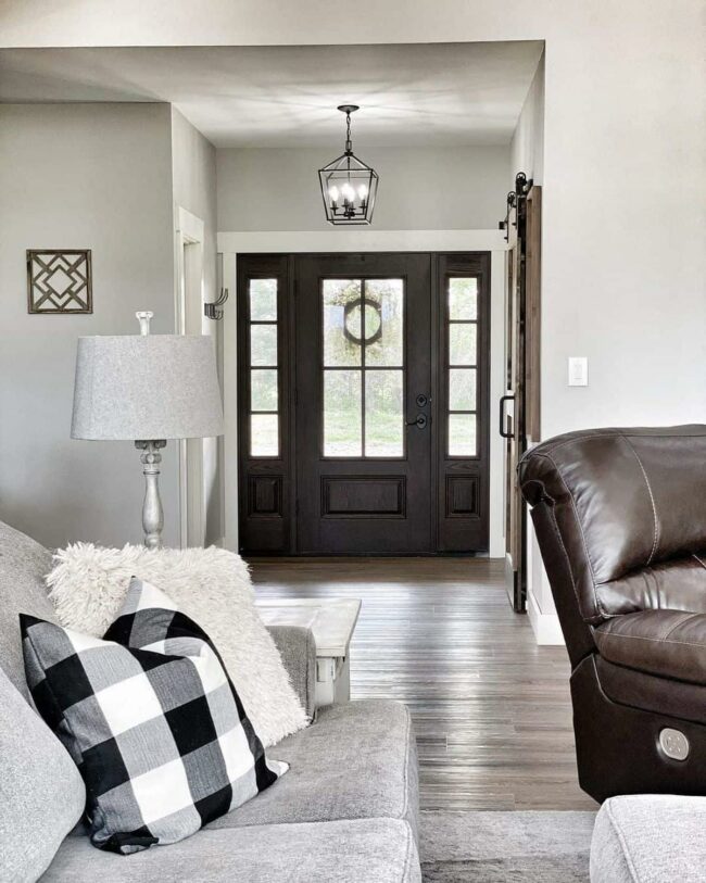 Rustic charm radiates from this living room's welcoming design, where a dark wood farmhouse door with glass sidelights opens into an inviting space.