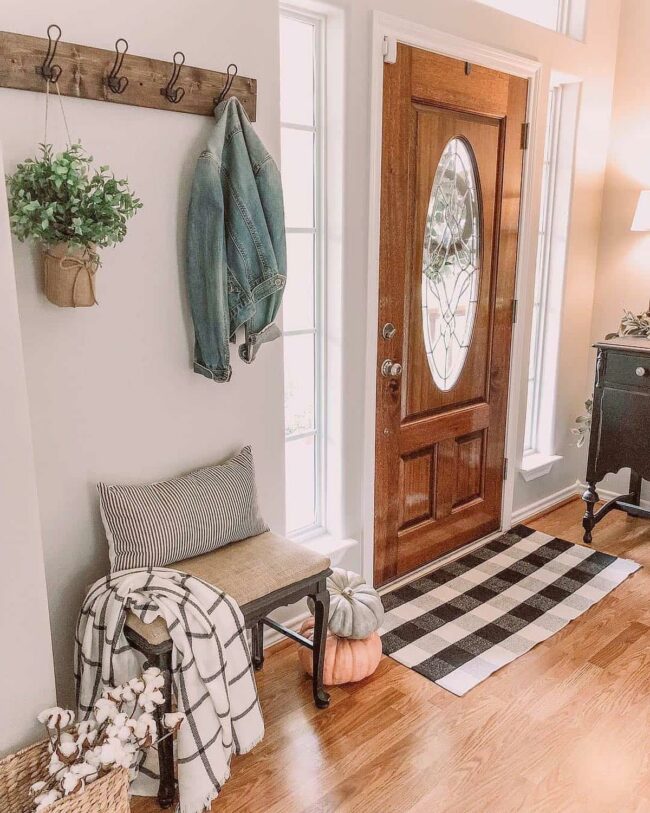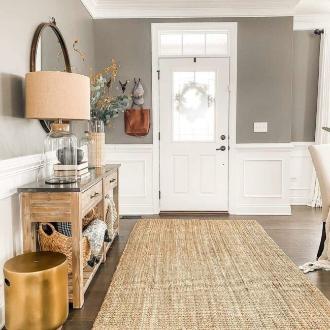 Rustic wood floors anchor the entryway with warmth and character, complemented by a woven mat that adds subtle texture.