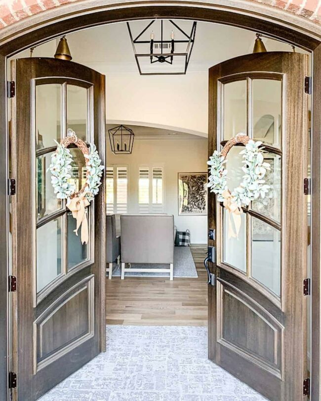 Arched wooden doors with glass panels create an elegant entryway that instantly captures attention.