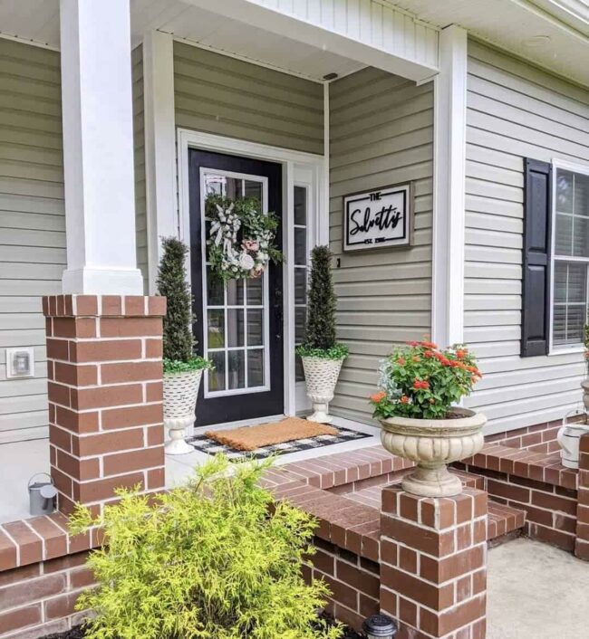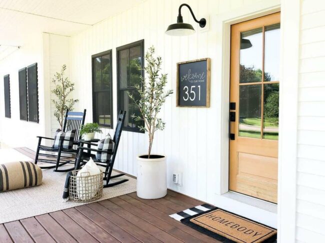 White planters flanking layered welcome mats bring clean sophistication to the porch design.