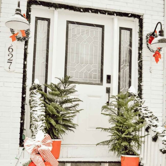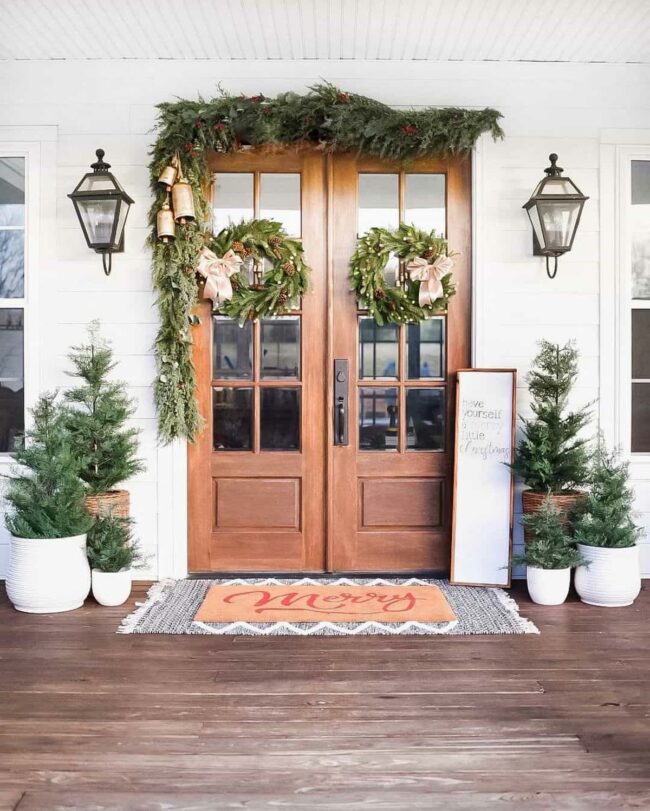 Matching wreaths and pine garlands gracefully drape across the entrance, transforming the space into a festive sanctuary.