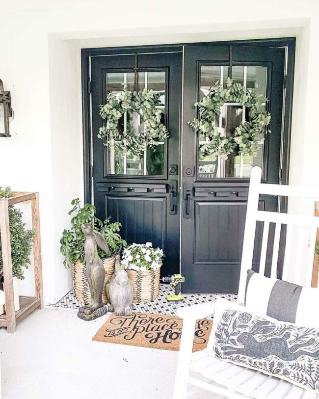 Black and white glass-paneled doors pop against off-white siding, creating instant visual drama for this home's entrance.