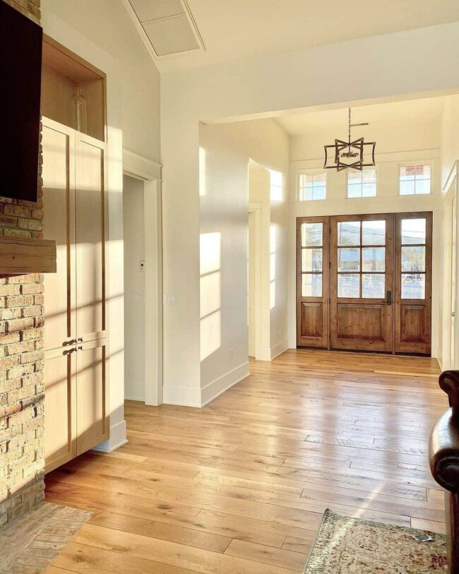 Natural light streams through the door's glass panels, making the room feel expansive and airy.