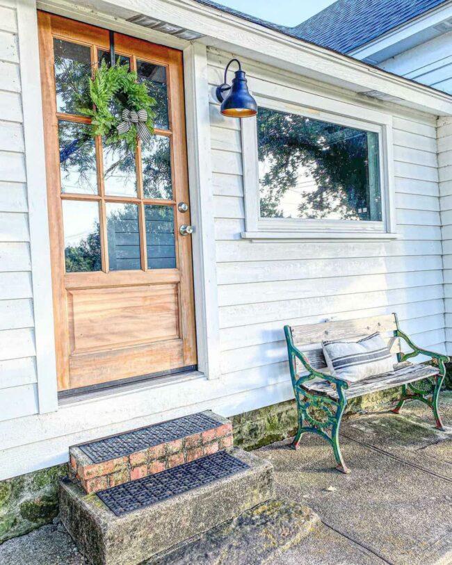 A charming lantern light fixture hangs above, casting a gentle glow on the porch.
