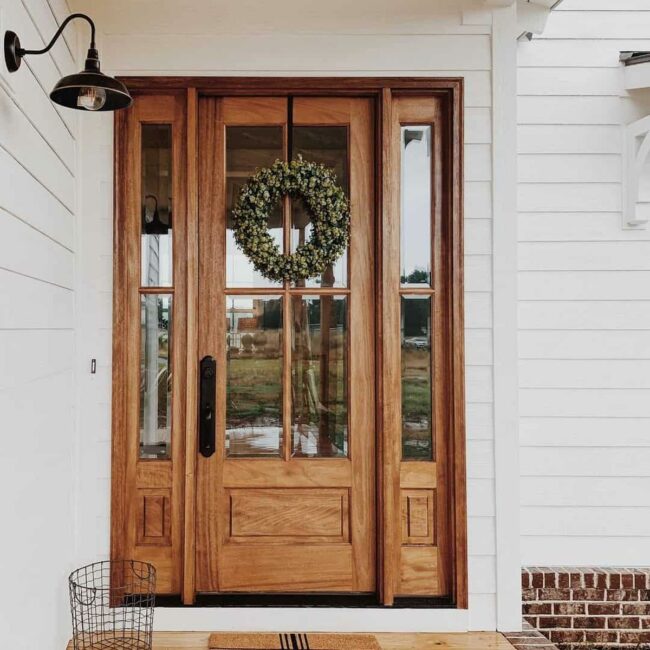 Sunlight floods through glass panels of a stained wood front door, instantly elevating a welcoming entryway.