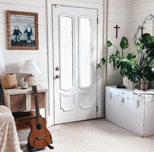 White glass-paneled doors welcome you into a charming entryway adorned with rustic shiplap walls that radiate warmth and character.