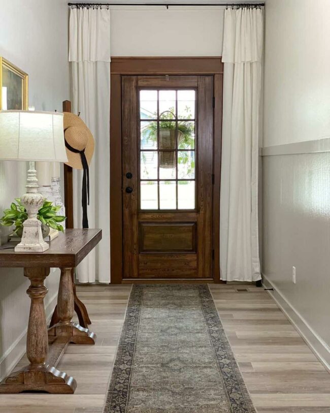 White curtains drape softly beside the entrance, balancing the rich wood tones.