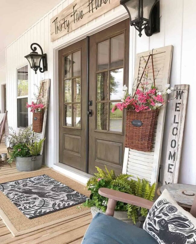 Vintage shutters adorned with cascading pink flower baskets add a delightful pop of color and nostalgic charm.