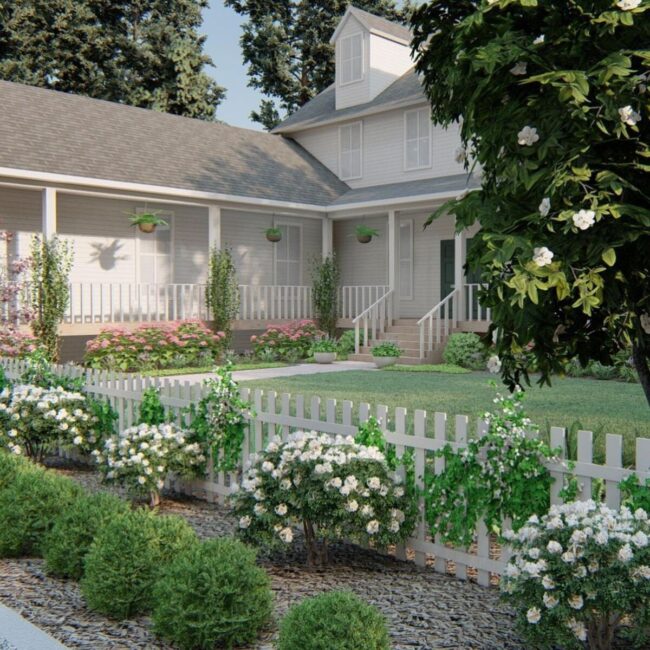 Strategic landscaping alongside fence lines amplifies outdoor charm, using colorful flowers and lush shrubs to frame property edges.