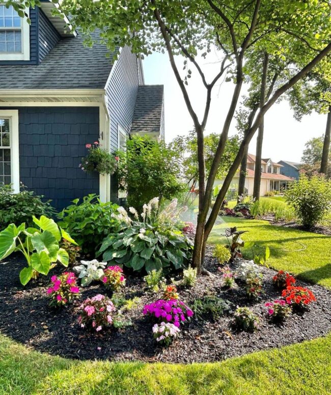 Rich, dark mulch creates a dramatic contrast against green lawns and colorful flower beds.