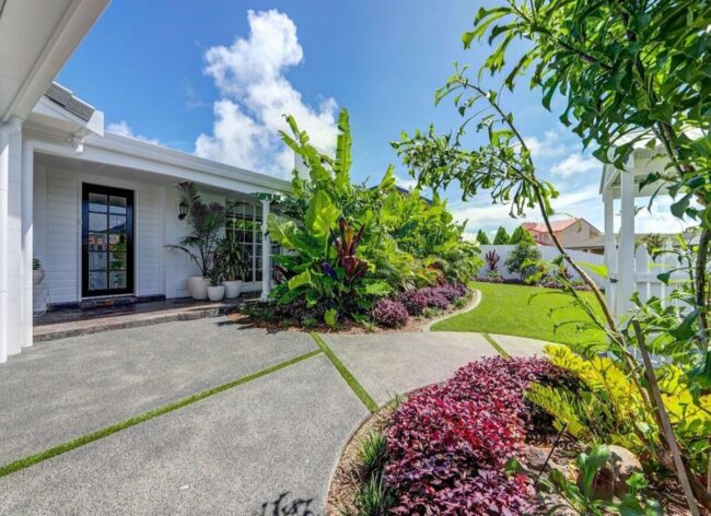 Tropical front yards transport you to a paradise sanctuary, instantly elevating home exterior design with exotic palms as dramatic focal points.
