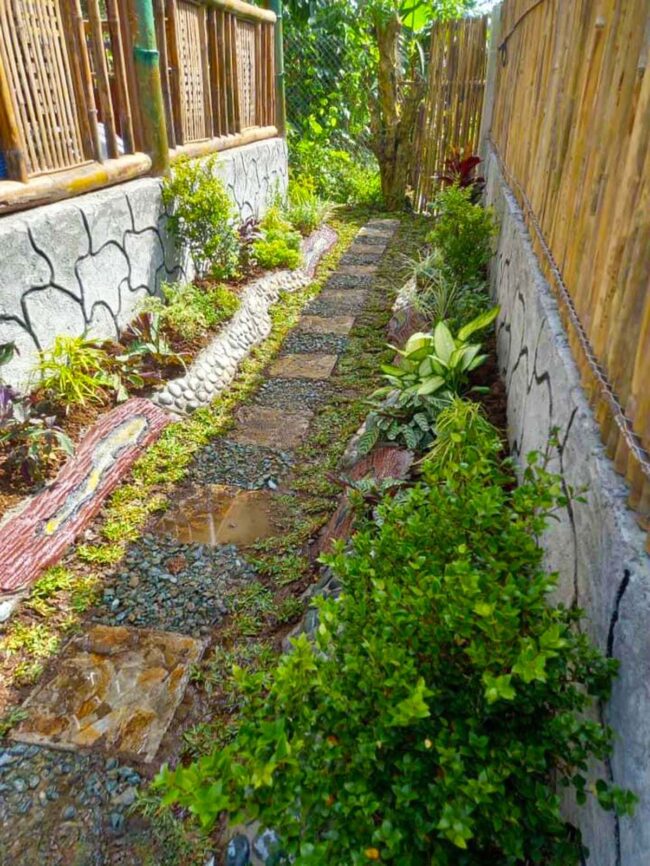 Moss-covered surfaces add a soft, aged character to the walkway, suggesting years of quiet transformation.