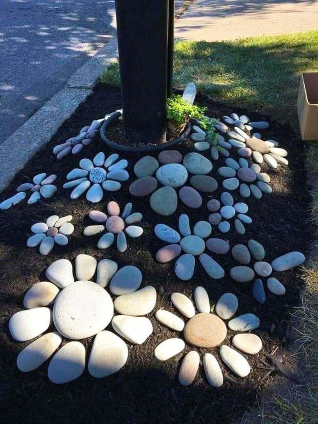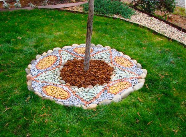 Natural pebbles crafted into intricate circular patterns provide visual delight while serving critical ecological functions for young trees.