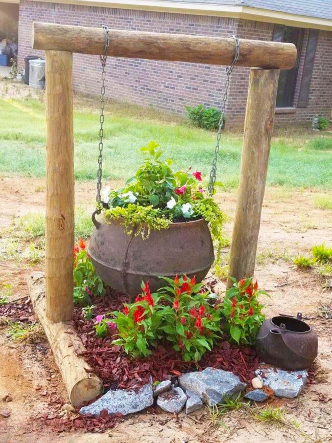 Garden enthusiasts adore this rustic planter design featuring an antique iron cauldron suspended from a sturdy wooden frame, creating a captivating focal point in outdoor spaces.
