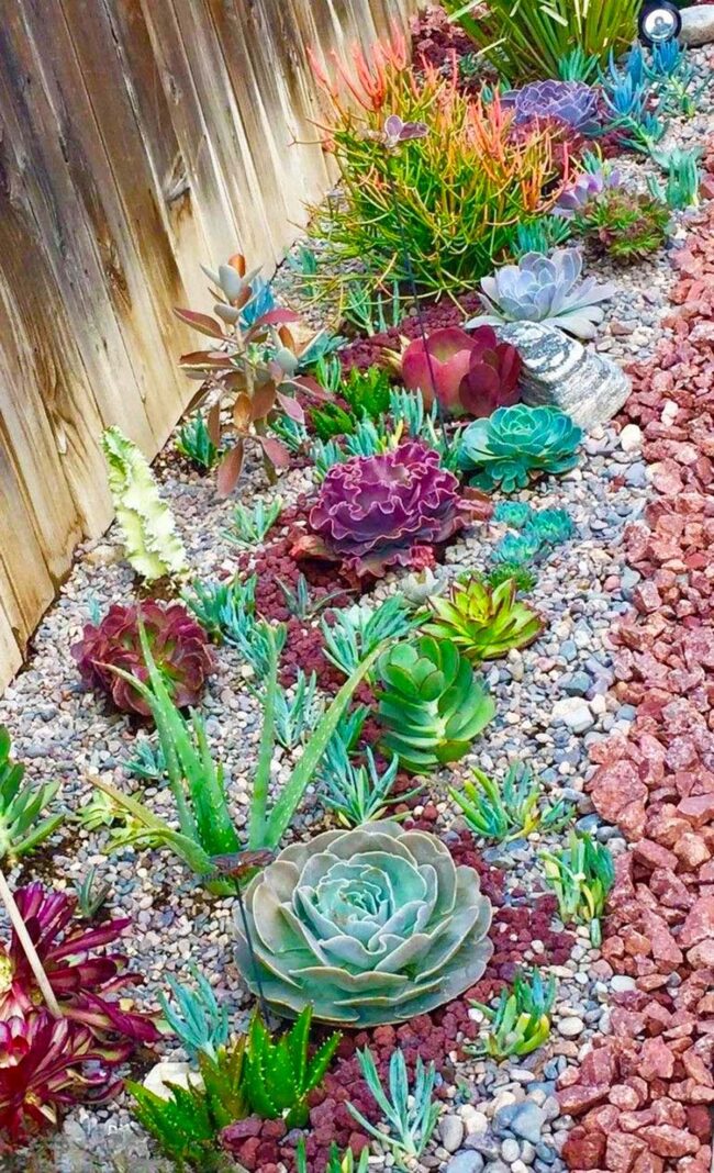 Strategic plantings mix jade, echeveria, and aloe varieties in compelling patterns across small garden areas.