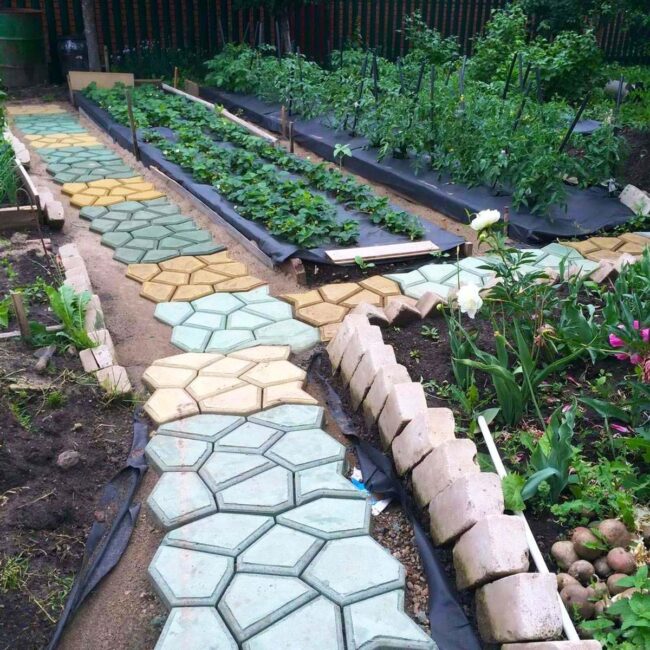 Hexagonal paving stones wind through a lush vegetable garden, creating an enchanting pathway that celebrates nature's design.