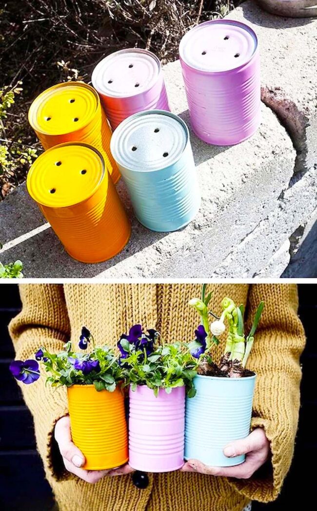Orange, purple, and other vibrant colors make these recycled containers stand out against garden backgrounds or windowsills.