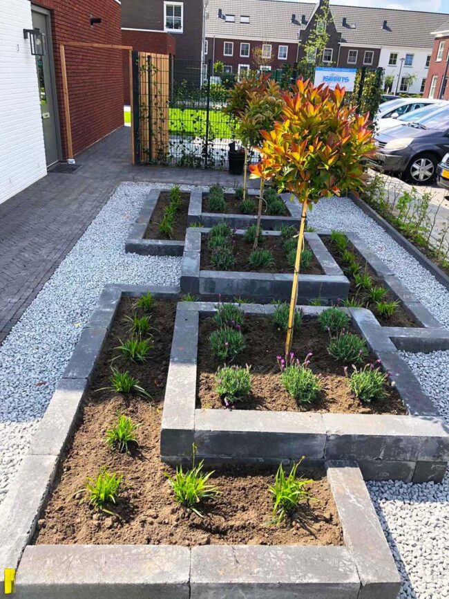 Ornamental trees punctuate the design, adding vertical interest and softening geometric angles.
