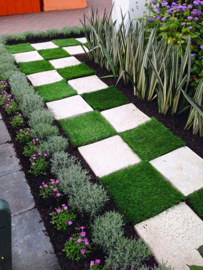 Modern landscape designers love checkerboard garden paths that blend artificial grass and white pavers for a stunning visual impact.