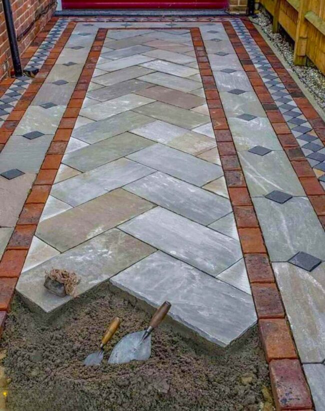 Slate herringbone tiles create a mesmerizing pattern, showcasing exceptional craftsmanship alongside warm red bricks that frame the elegant design.