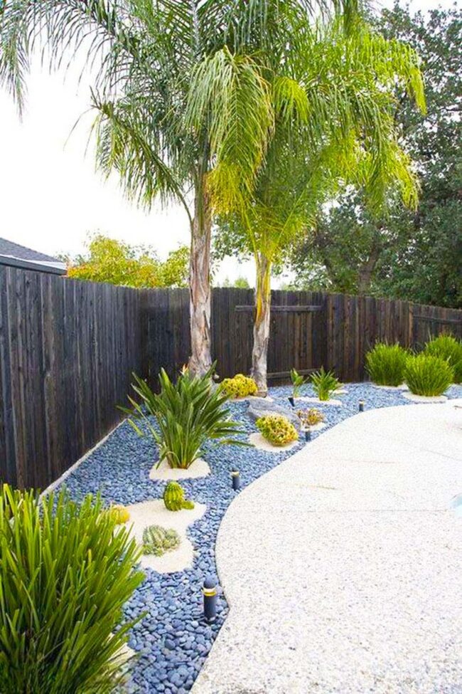 Blue-grey pebble ground cover introduces a soothing texture while reducing moisture loss and suppressing weed growth.