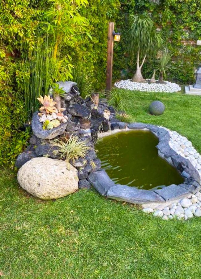 Complementary materials like stone and pebbles enhance the overall aesthetic, blending natural textures seamlessly.
