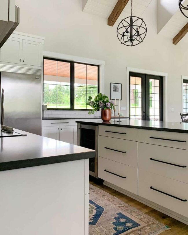 White cabinets featuring black pulls create crisp visual contrast and balance.