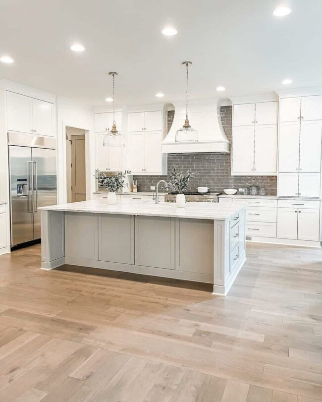 Polished nickel pulls accent the pristine white island, adding metallic sophistication to the design.