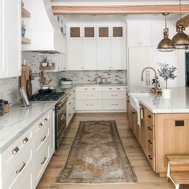 Kitchen design reaches new heights with a vintage white and blue runner rug anchoring the space next to a crisp white island.