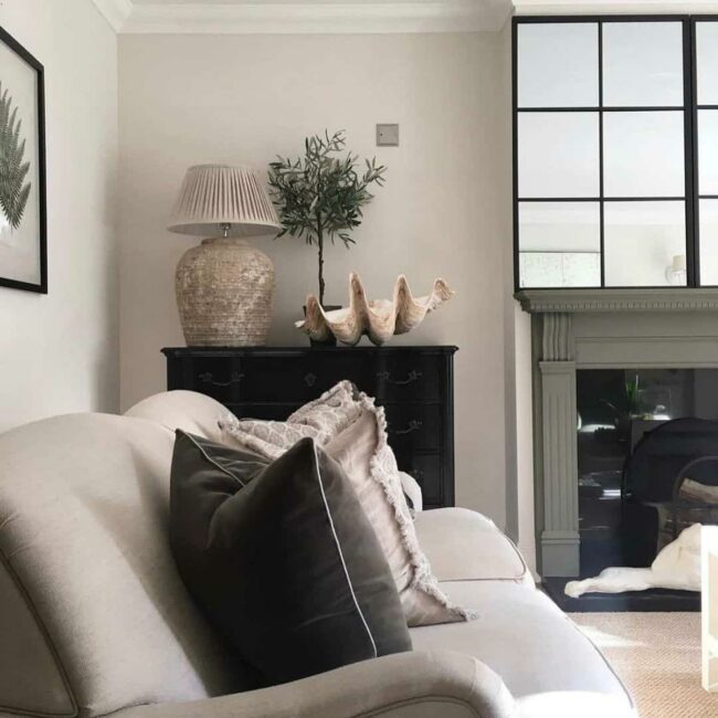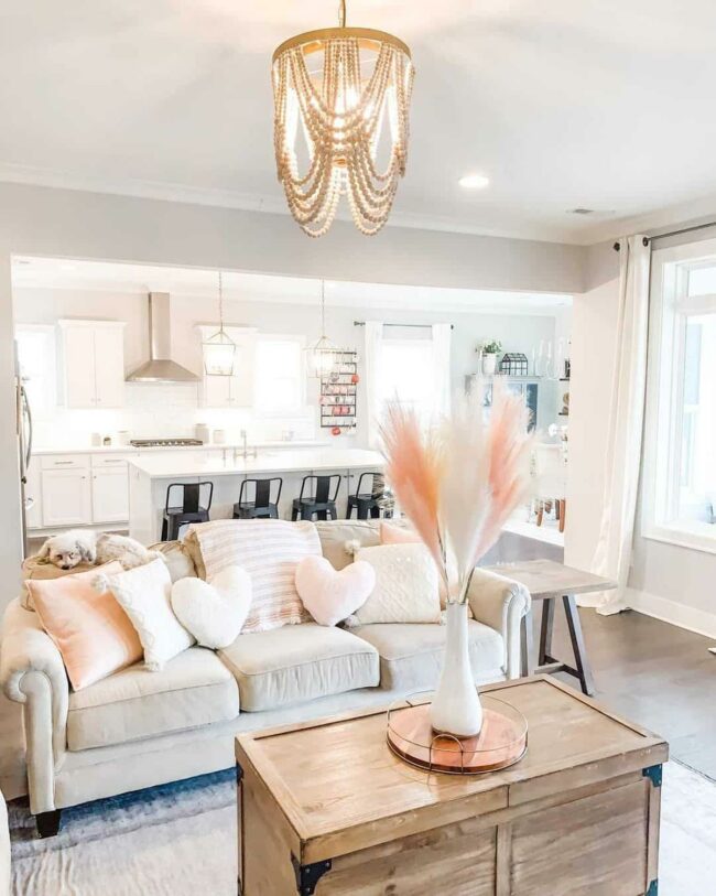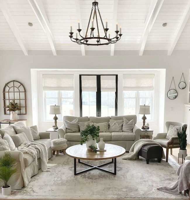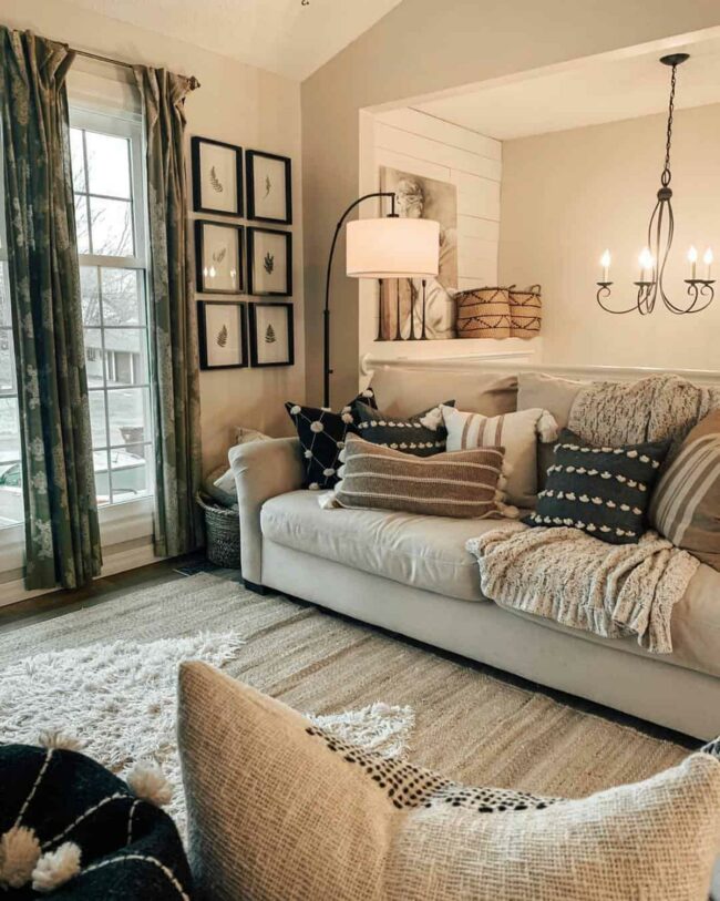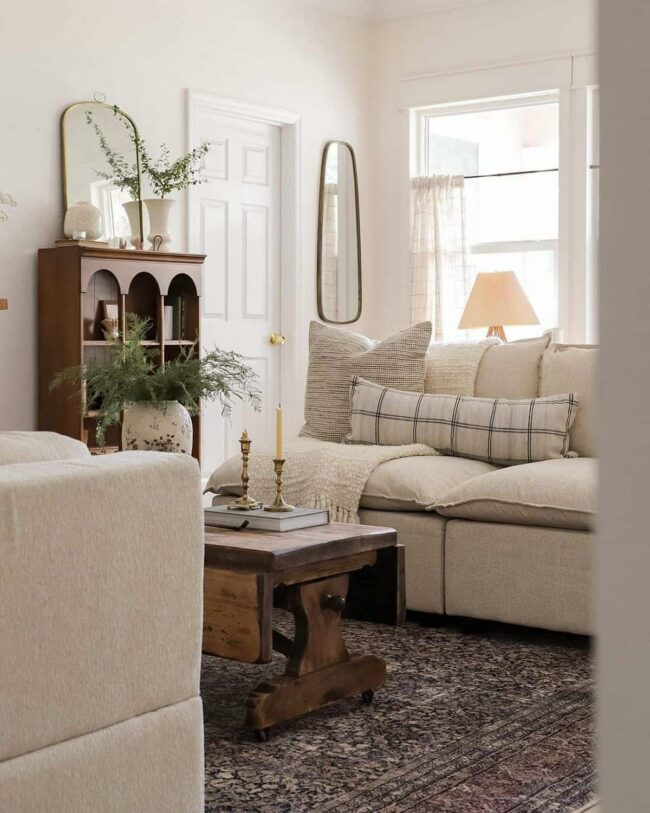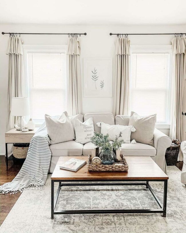 Neutral beige sofa anchors the area with understated elegance, while farmhouse-style throw pillows create visual interest.