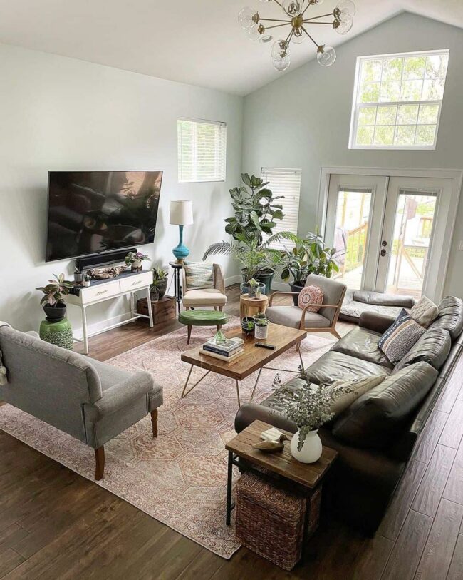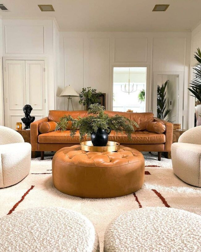 Warm-toned rugs anchor the design, weaving together the eclectic elements with understated elegance.