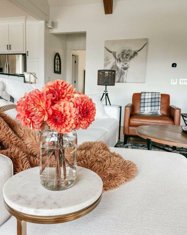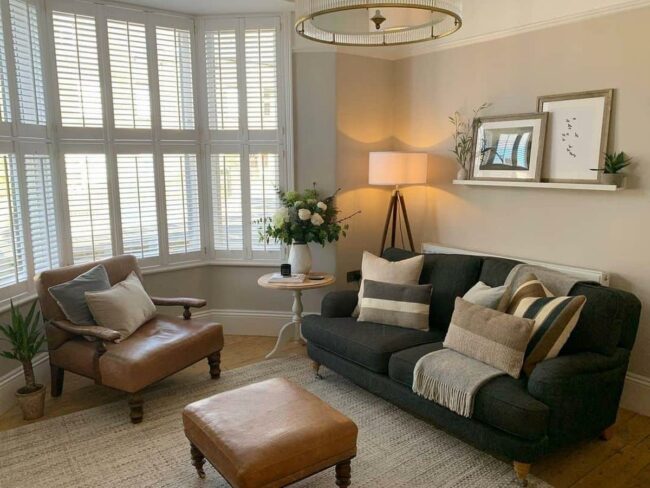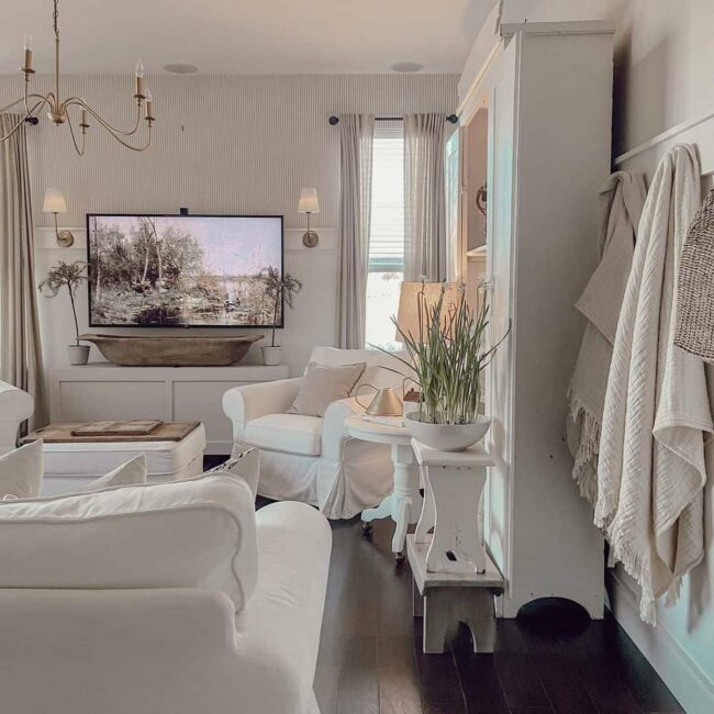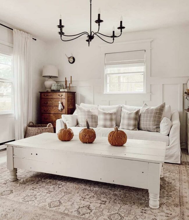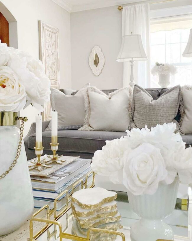White table lamps and elegant candlesticks radiate warmth in your living room, casting a gentle glow that feels instantly inviting.