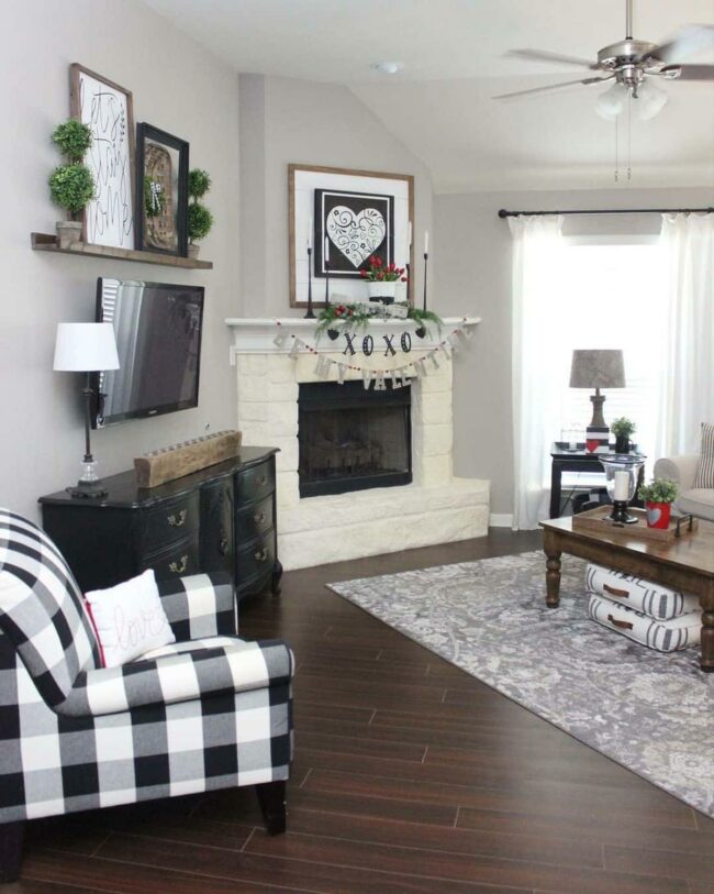 Black hutch details perfectly complement the gray sofa, providing visual interest and depth to the design.