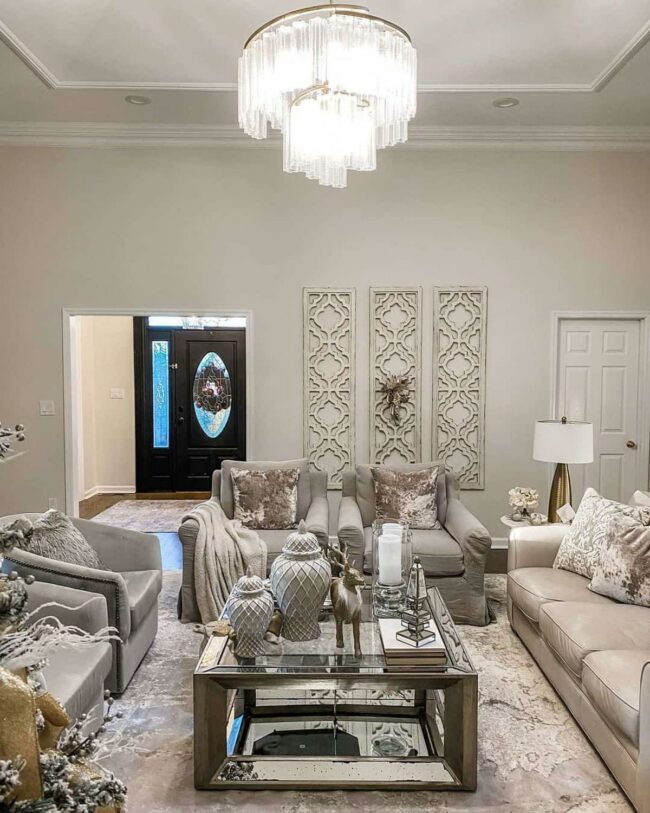 Subtle gray and white color palettes beautifully reflect illumination, amplifying the chandelier's magical glow.