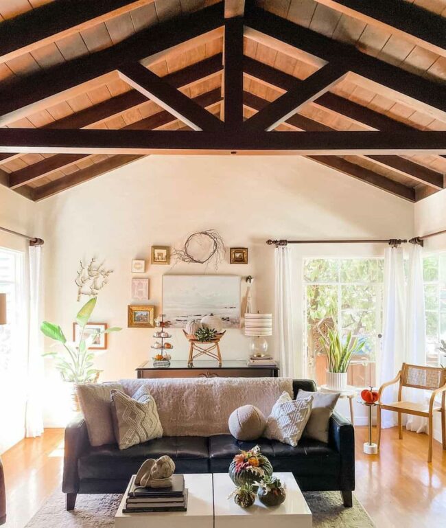 Black leather furniture adds a modern edge against charming boho-farmhouse textiles, crafting a seamless design harmony.