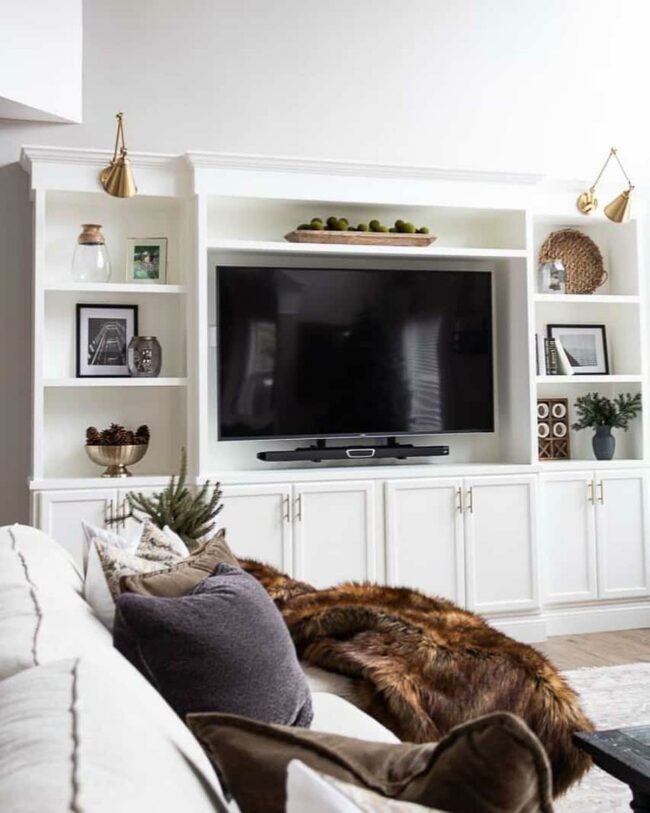 Sconce lights in golden tones elevate your living room with modern farmhouse charm, casting a warm, inviting glow across carefully curated bookshelves.