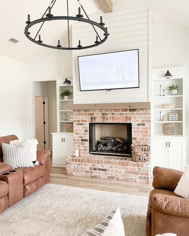 Rustic brick fireplaces complement the iron fixture's bold design, creating an inviting aesthetic that draws attention.