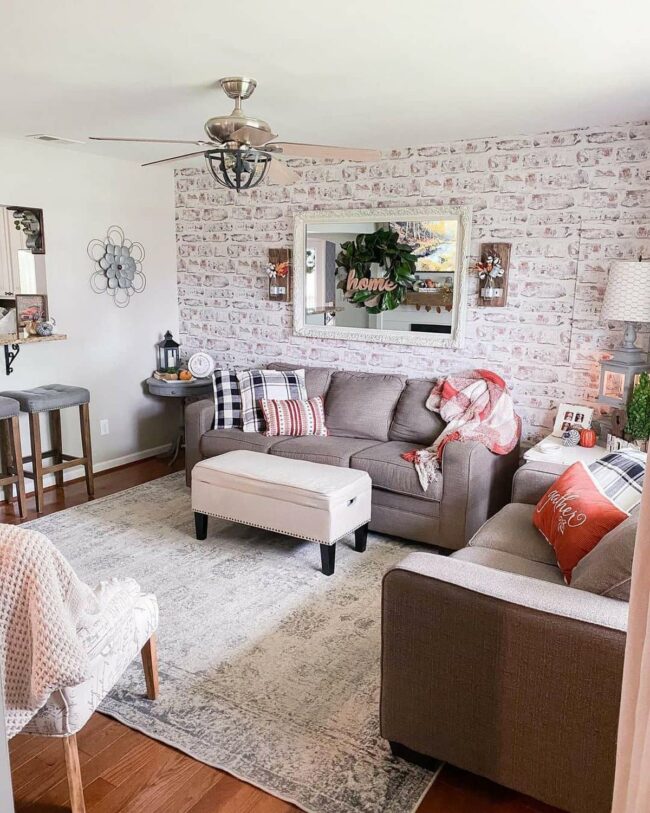 Painted brick wallpaper instantly elevates your living room's seasonal charm, creating a warm and welcoming atmosphere.