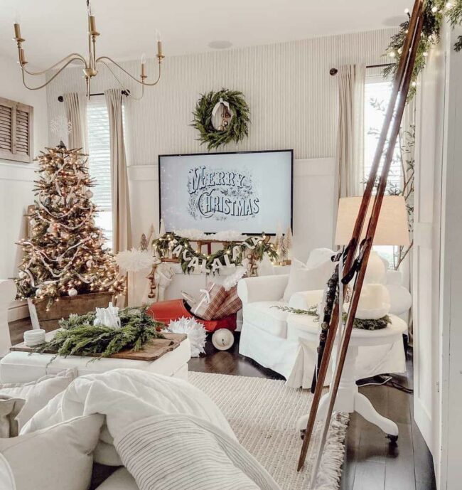 Winter magic sparkles in this charming living room where white and beige striped walls create a welcoming sanctuary.