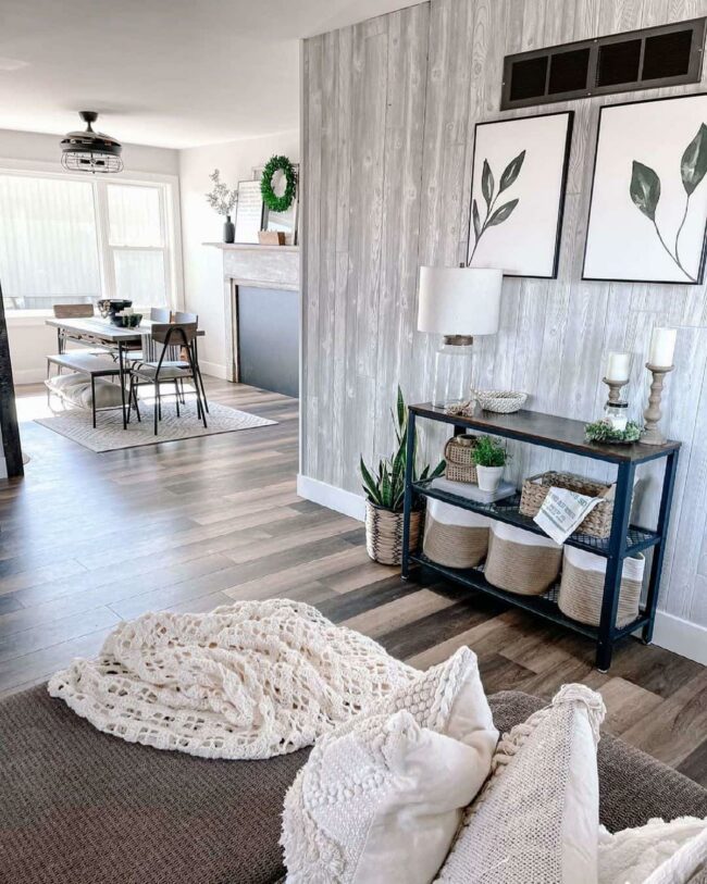 Gray wood print wallpaper elevates plain walls, adding unexpected depth and character to entrance spaces.