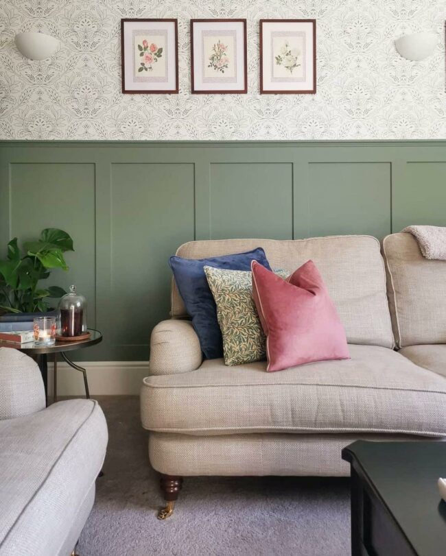 Green board and batten wainscoting sets a bold, earthy backdrop in this captivating room design.