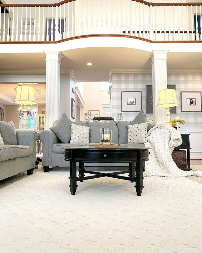 Grey roll arm sofas beckon relaxation near a striking black coffee table that anchors the room's design.