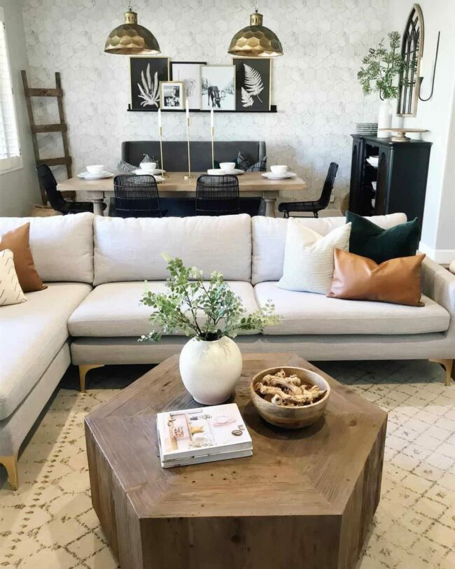 Two-toned furniture pieces like the coffee table enhance the overall aesthetic with understated elegance.