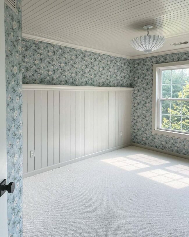 Vertical shiplap accent walls provide visual harmony, softening the floral pattern's bold presence.