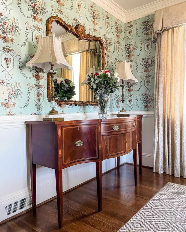 Soft green and gold floral wallpaper whispers classic sophistication, complementing each carefully selected element.