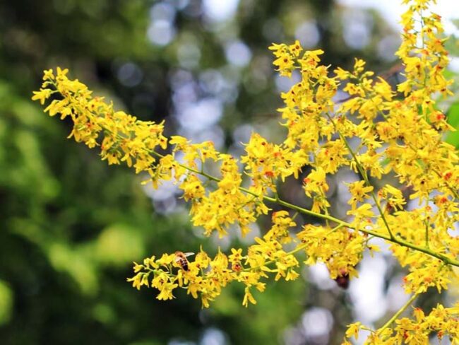 Goldenrain trees burst with brilliant yellow blossoms that cascade like vibrant curtains across lush green landscapes, captivating garden enthusiasts with their extraordinary beauty.